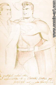 Many have commented that Shuster's artwork was done in a crude, narrative style (which comic artist Jim Steranko likened to editorial cartooning) which was reminiscent of Milton Caniff's art. Indeed, under his own inks, Shuster was very polished and illustrative, and his style itself became a model for many artists in the comic book industry during the thirties until the art of Lou Fine, Will Eisner, Jack Kirby and the influence of Hal Foster, Caniff & Alex Raymond revolutionized the medium. Siegel & Shuster would again sue DC in 1978 for royalties from the Superman character, and through the help of then DC publisher in charge Carmine Infantino, and comics artist Neal Adams, as well as public outcry from the comics hobby, they received a settlement from DC for $35,00 each per year for the remainder of their lives. Still a paltry settlement when taking into account the hundreds of millions of dollars that DC made off the character in comics, from movies & radio, toys & other merchandising. Even while DC sued other publishers, like Fawcett & Fox for plagiarizing their flagship hero, they themselves were copying him in their own books (Starman in Adventure Comics being the most obvious). Siegel & Shuster did not profit from these in-house swipes either. Joe Shuster, nearly blind & very bitter about his treatment from DC died July 30, 1992 just short of his seventy-eighth birthday. Though forgotten by the publisher that should have eulogized him as their savior, he will never be forgotten by the millions of fans worldwide who have read his legendary creation. |