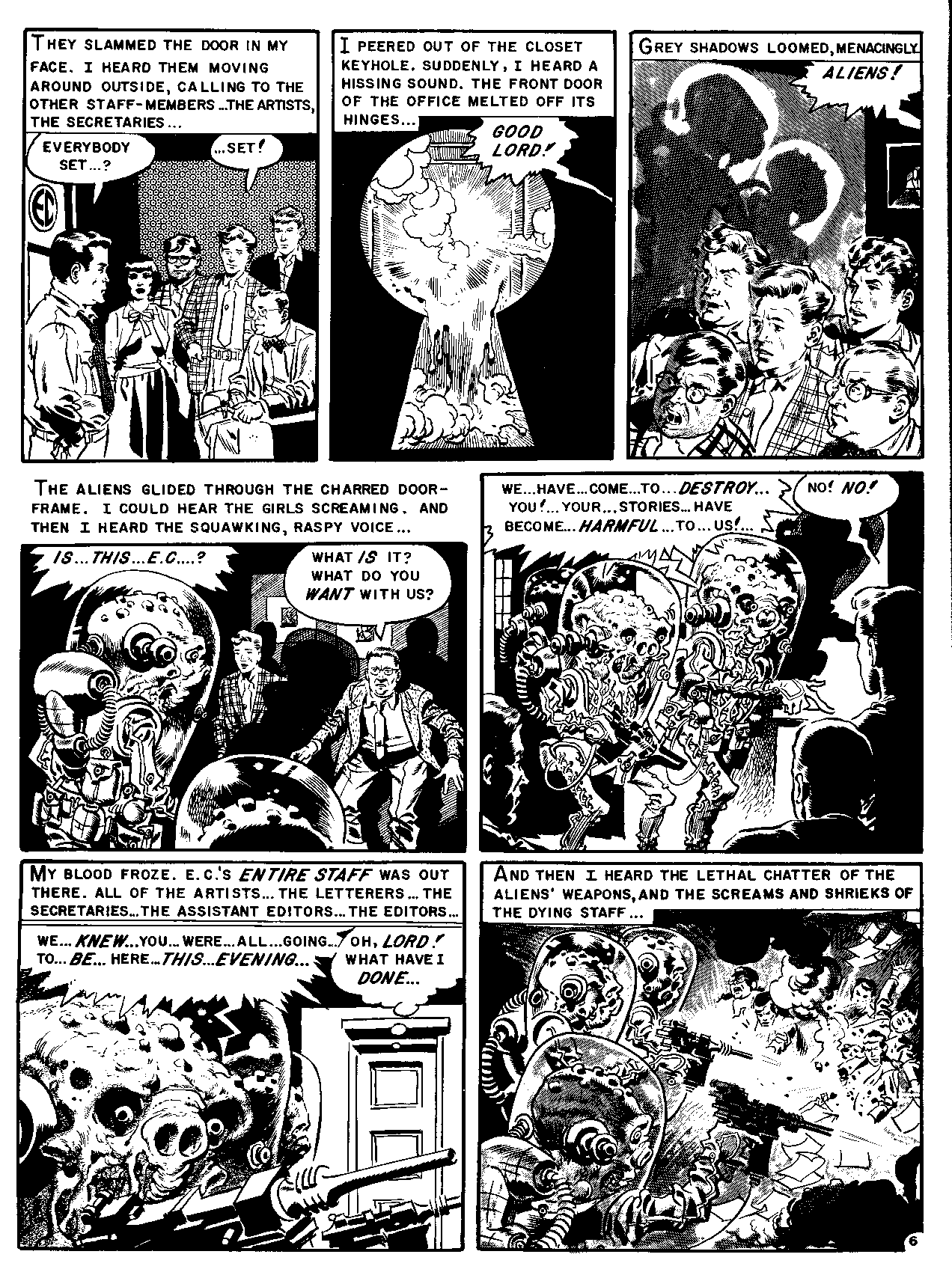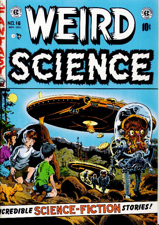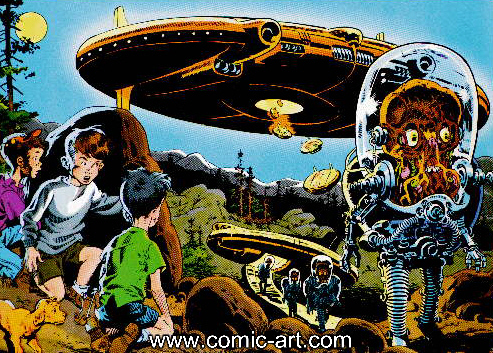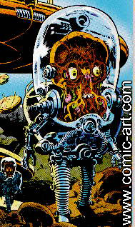 When Wood joined EC in 1950 he started slowly as he was doing alot of material for a number of publishers and would continue to throughout the period. But during this time his art was developing, so much so that within less than a year his work had progressed tremendously. He was to become possibly the premier science fiction comic artist of his time, producing a weighty volume. While at EC he also did some of the best humor material ever in first Mad comics, and then Mad magazine. But comic book publishing was about to be decimated by Frederic Wertham's book "Seduction of the Innocent" which suggested that comic books were a major contributor to juvenile delinquency and as such needed to be abolished, and they almost were. Wally had begun doing advertising work in the middle fifties and his close association with science fiction comics led to his doing much work for the sci-fi digests and paperbacks. He assisted on Dan Barry's "Flash Gordon" daily strip for a short while, George Wunder's "Terry & the Pirates" and reportedly a little bit for Hal Foster's "Prince Valiant" before joining Jack Kirby to do some work on the "Sky Masters" strip and the DC comics "Challengers of the Unknown". In the early sixties, Wally did some work for Marvel Comics and then Tower publications where he created the "THUNDER Agents". He also embarked on several self published ventures in the fanzine world producing the magazine "Witzend" among others. He several other characters in the following years including Sally Forth, Heroes Inc and Cannon, but Wally's talents from this period waned due to his frequent bouts with alcohol abuse, which led to four strokes and kidney failure, until finally his work was just a shadow of his former work. By 1979 Wally almost exclusively produced pornographic work, culminating in the three issue run of "Gang Bang" comics. The third issue being published after his death. Wally Wood is most likely the best artist to ever illustrate science fiction comics, a group that includes such greats as Frank Frazetta and Al Williamson (Williamson has said Wally was the best comic book artist ever), but he was also one of the fiftie's top humorists. His use of ink to thrill fans of comic art will always be legendary. Wally died on November 2, 1981 of a self inflicted gunshot wound. |